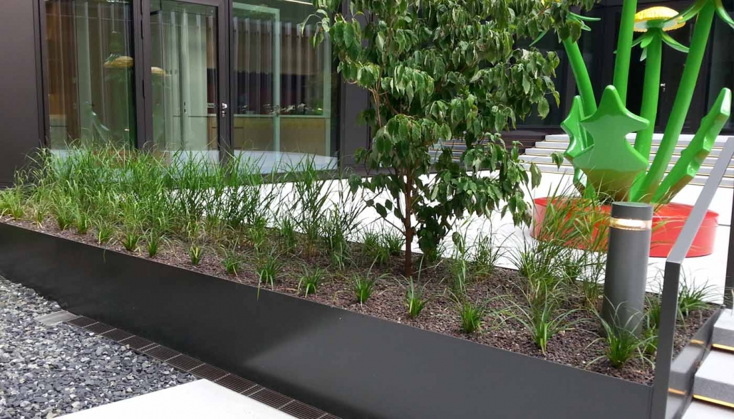 Im Innenhof schafft eine Stufenanlage Räume und verbindet zwei Geschosse miteinander. Ein wohl durchdachtes, hochwertiges Bepflanzungskonzept strukturiert den Raum und erfreut das